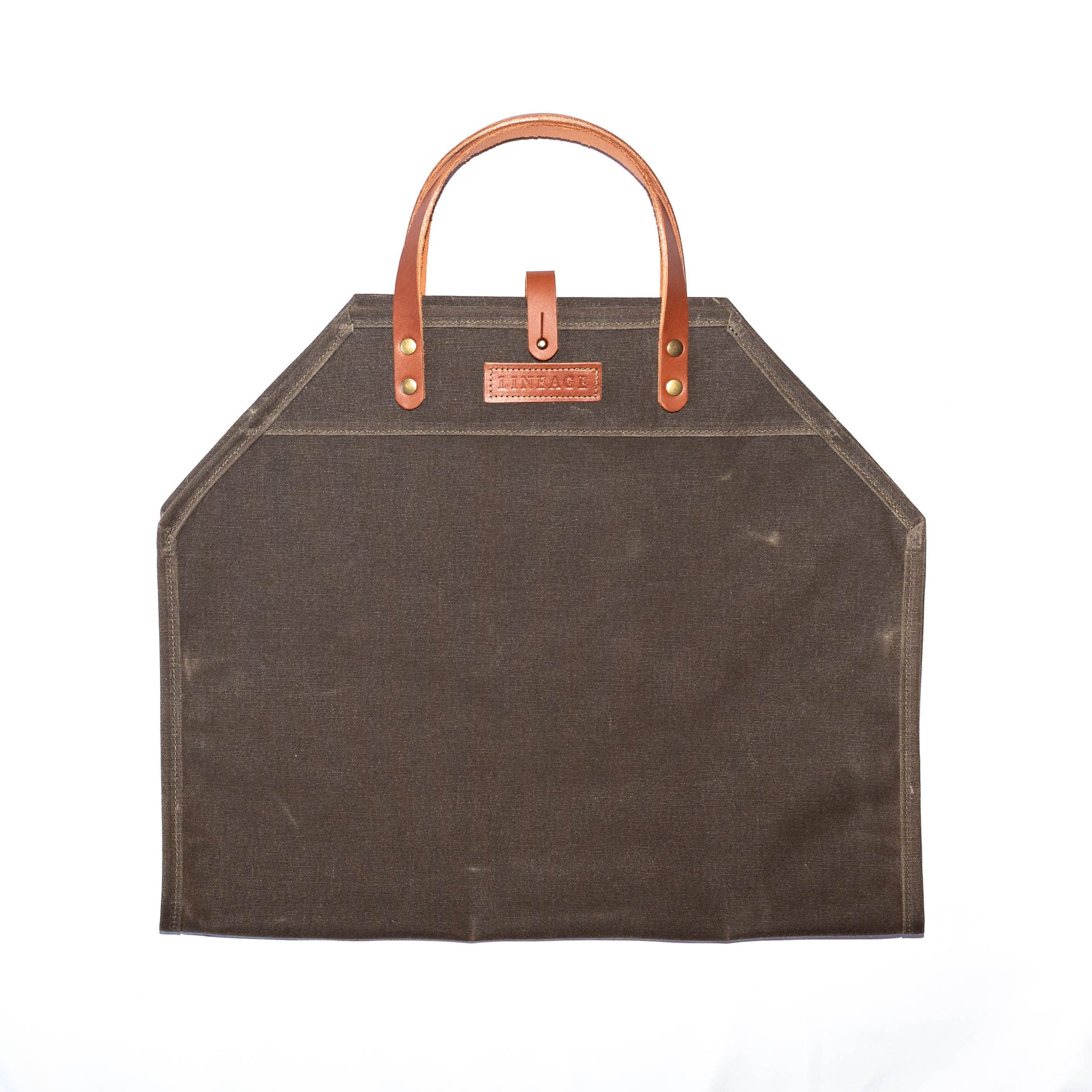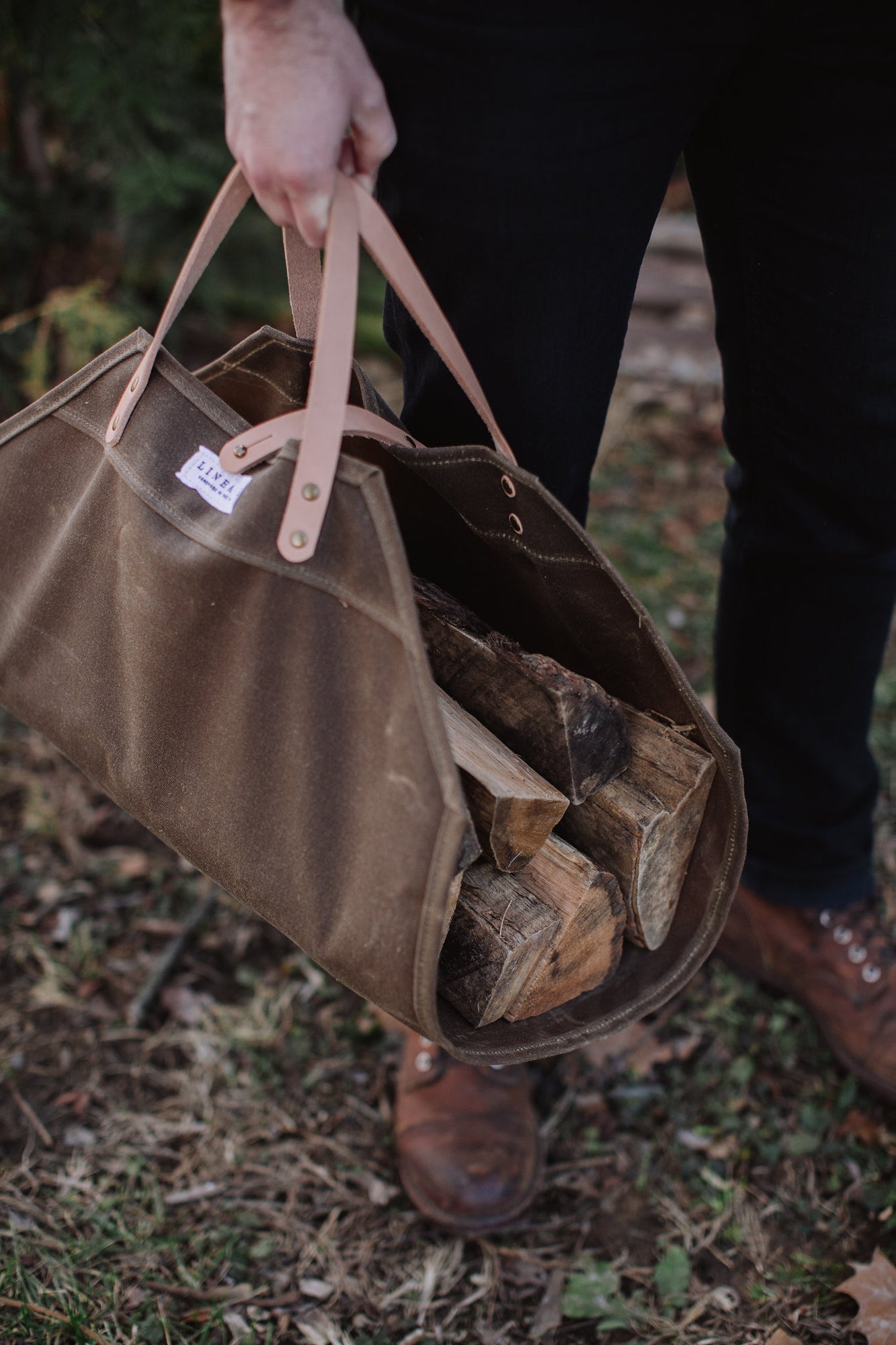 Our rugged, heavy duty firewood carrier made with thick, 19 ounce waxed cotton canvas, English Bridle leather straps, and solid brass hardware. Features a leather closure strap to keep the carrier secured even when you set it down. The canvas and straps will develop a nice patina with use.