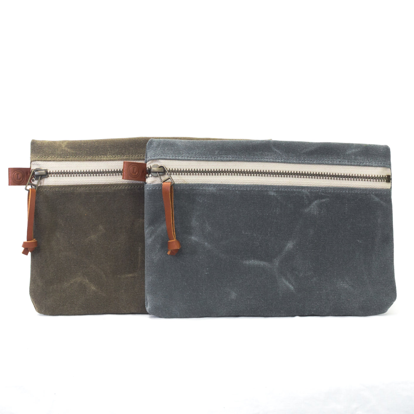Our zippered pouches are a great way to keep small items and accessories organized inside one of our bags. Their compact size is ideal for storing pens, pencils, earbuds, device cords, makeup, lip balm, or other small items. Handcrafted with waxed canvas, a YKK antique brass zipper, and bridle leather details.