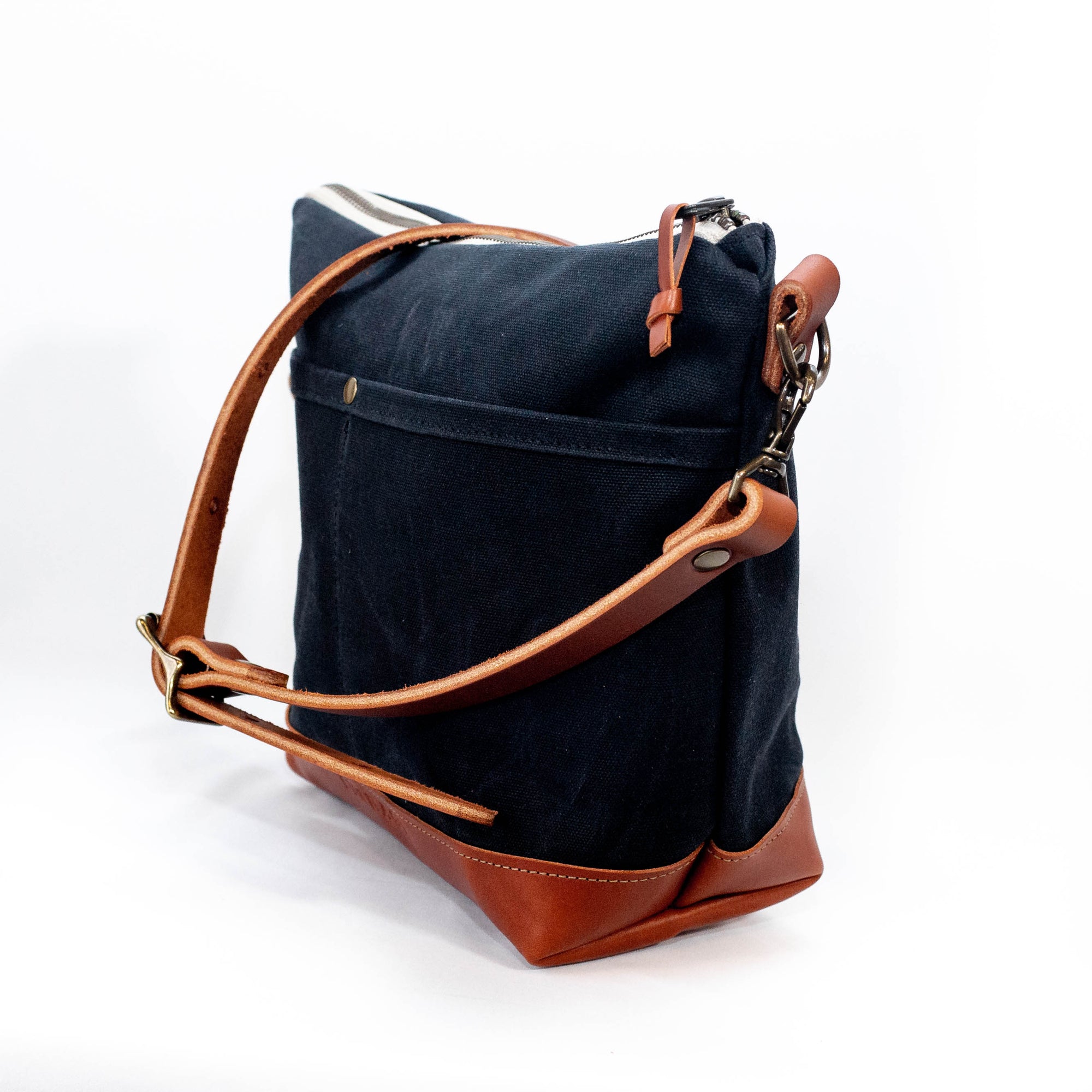 Features waxed canvas exterior, cotton duck lining, zippered main compartment, two small interior pockets, two exterior pockets, and a leather bottom panel for added durability and elegance. The removable shoulder strap adjusts for a variety of lengths, from 38"-46". The Chestnut bridle leather will soften and darken with daily use and exposure to sunlight, developing into a rich, dark brown patina. Handcrafted in Richmond, Virginia.