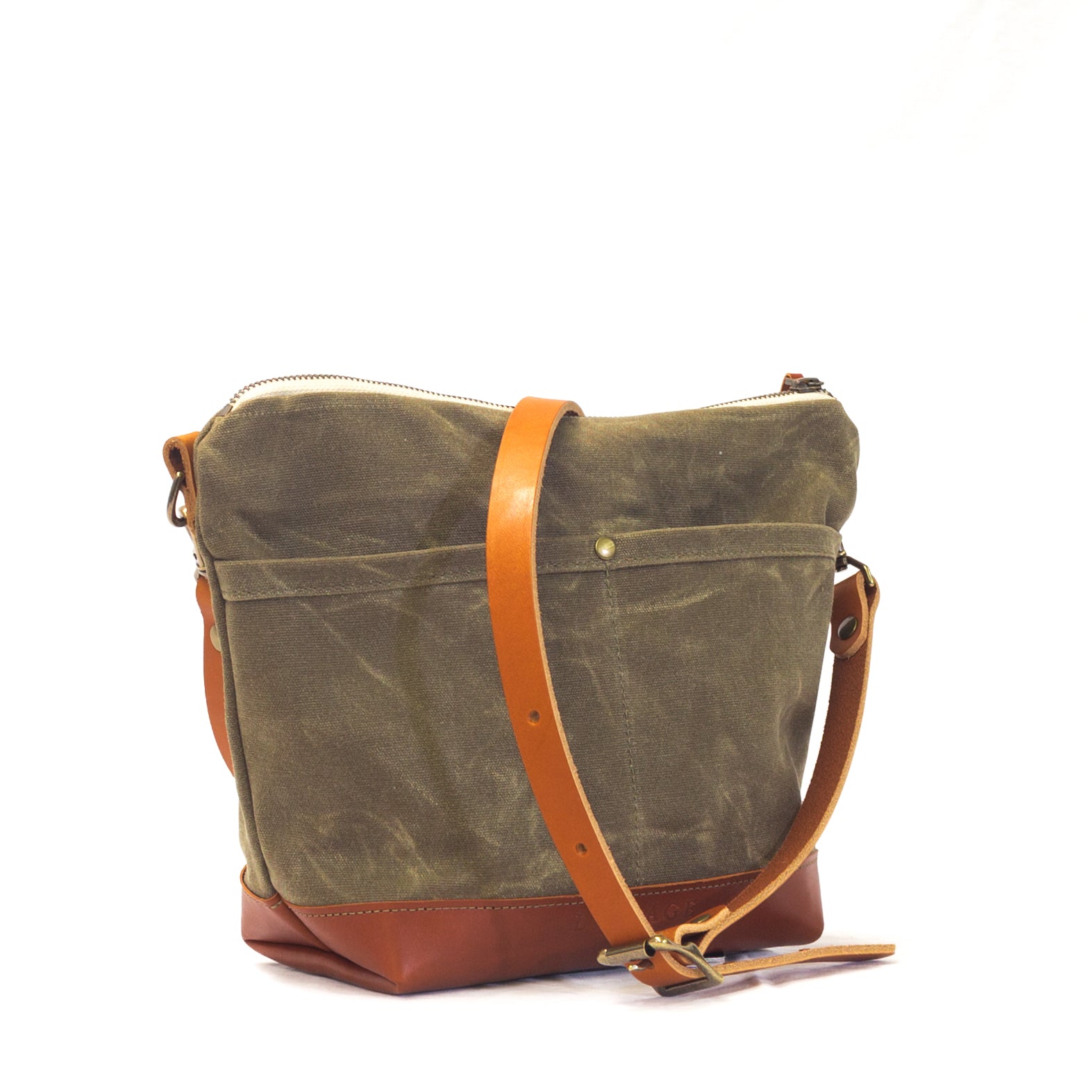 Features waxed canvas exterior, cotton duck lining, zippered main compartment, two small interior pockets, two exterior pockets, and a leather bottom panel for added durability and elegance. The removable shoulder strap adjusts for a variety of lengths, from 38"-46". The Chestnut bridle leather will soften and darken with daily use and exposure to sunlight, developing into a rich, dark brown patina. Handcrafted in Richmond, Virginia.