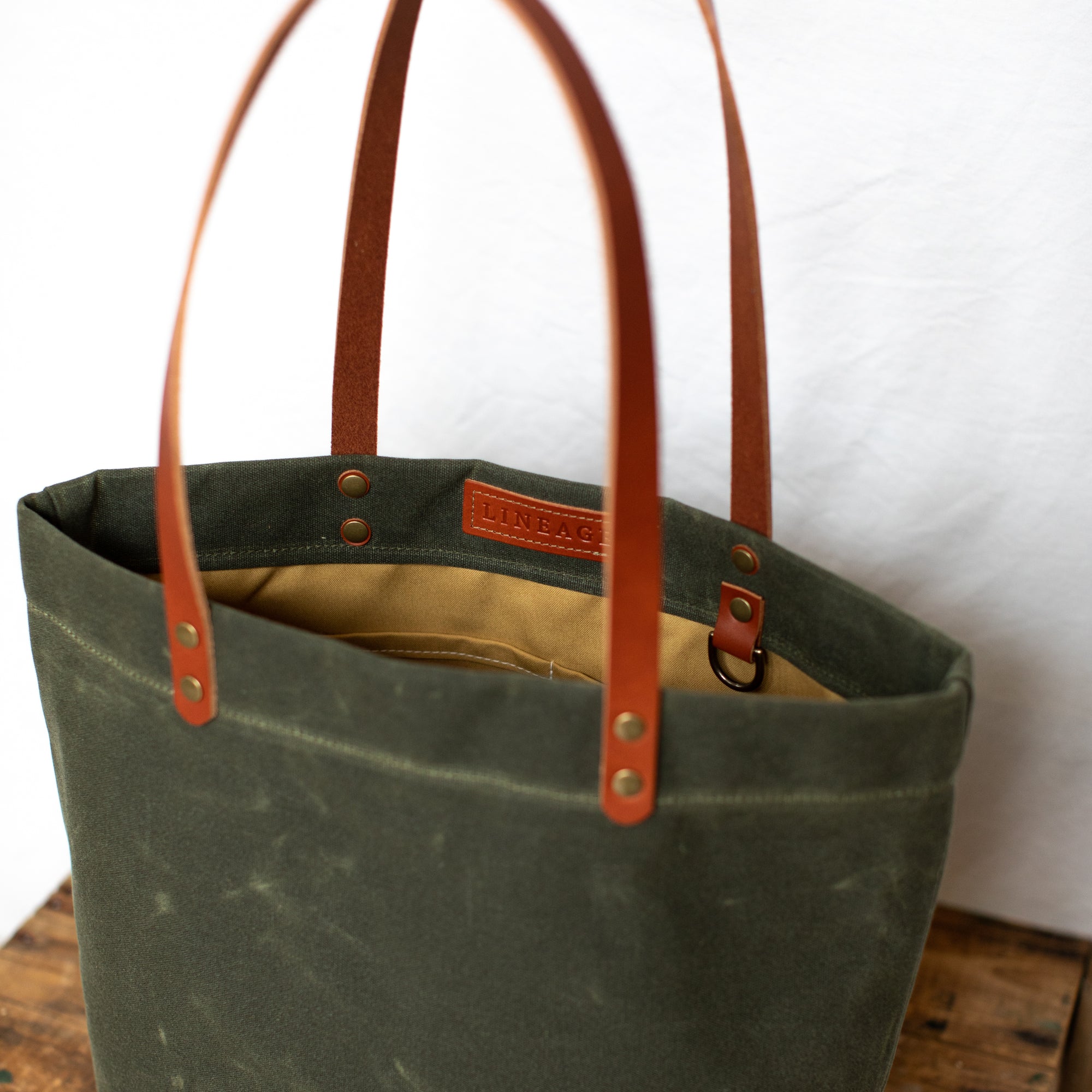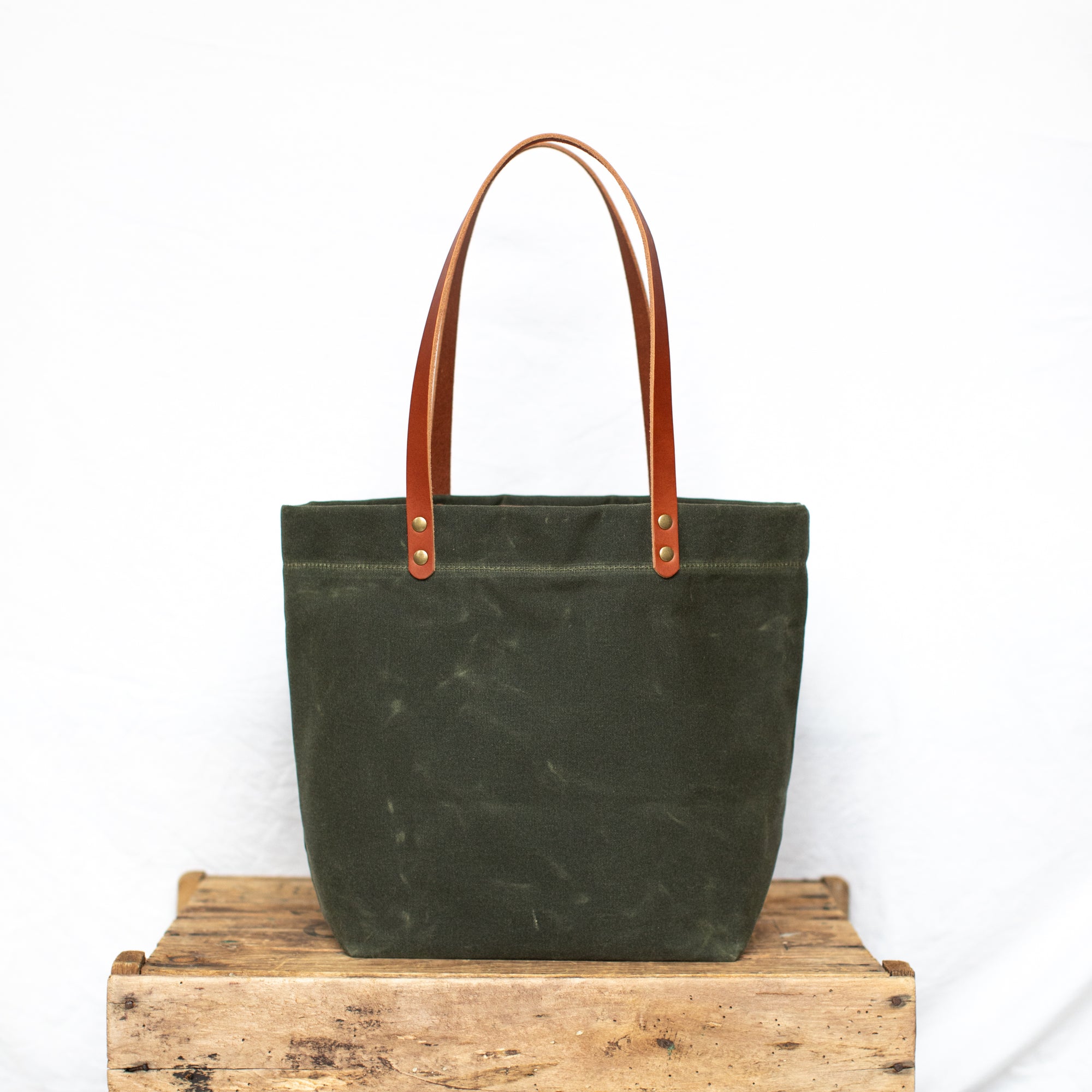 The Potomac Tote is our simple and straightforward waxed canvas tote bag. A versatile everyday bag, it's perfect for the office, farmers market, gym, beach, a night out on the town, or as a diaper bag. The chestnut bridle leather straps will soften and darken with daily use and exposure to sunlight, developing into a rich, dark brown patina. Handcrafted in Harrisonburg, Virginia.