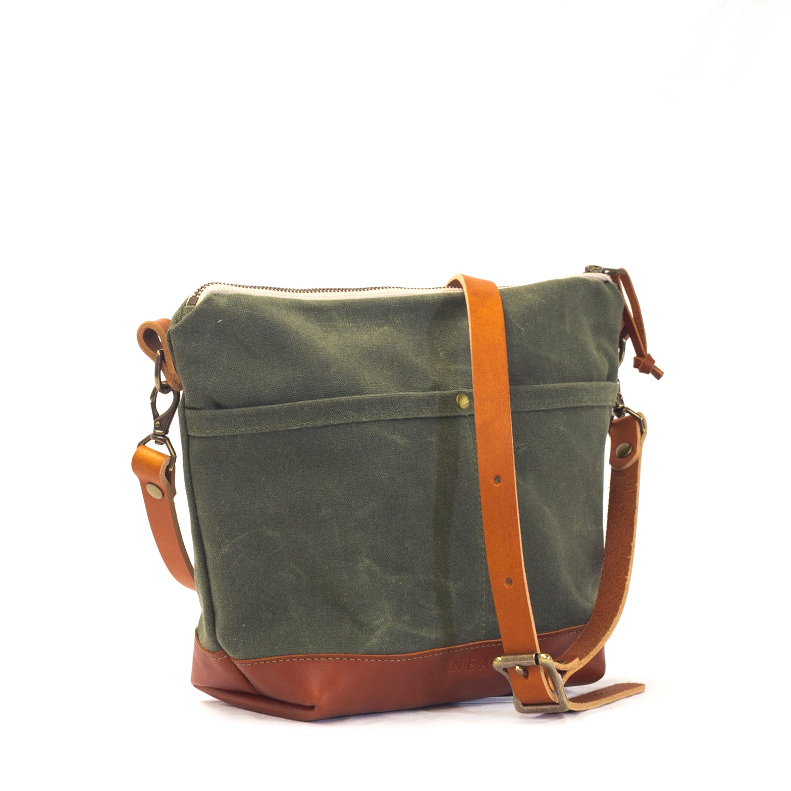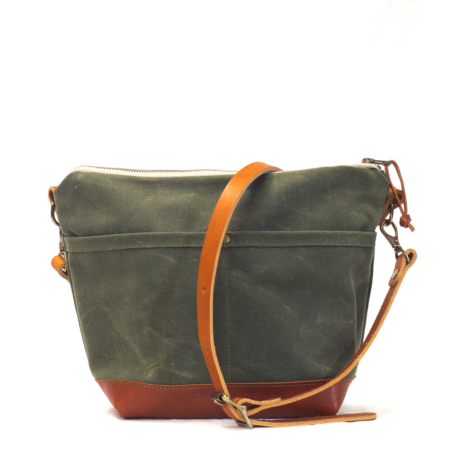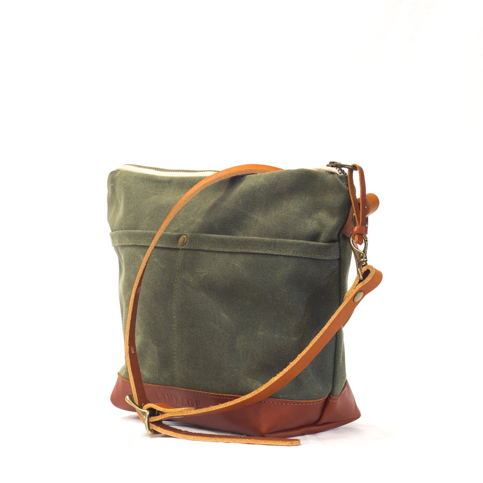 Features waxed canvas exterior, cotton duck lining, zippered main compartment, two small interior pockets, two exterior pockets, and a leather bottom panel for added durability and elegance. The removable shoulder strap adjusts for a variety of lengths, from 38"-46". The Chestnut bridle leather will soften and darken with daily use and exposure to sunlight, developing into a rich, dark brown patina. Handcrafted in Richmond, Virginia.
