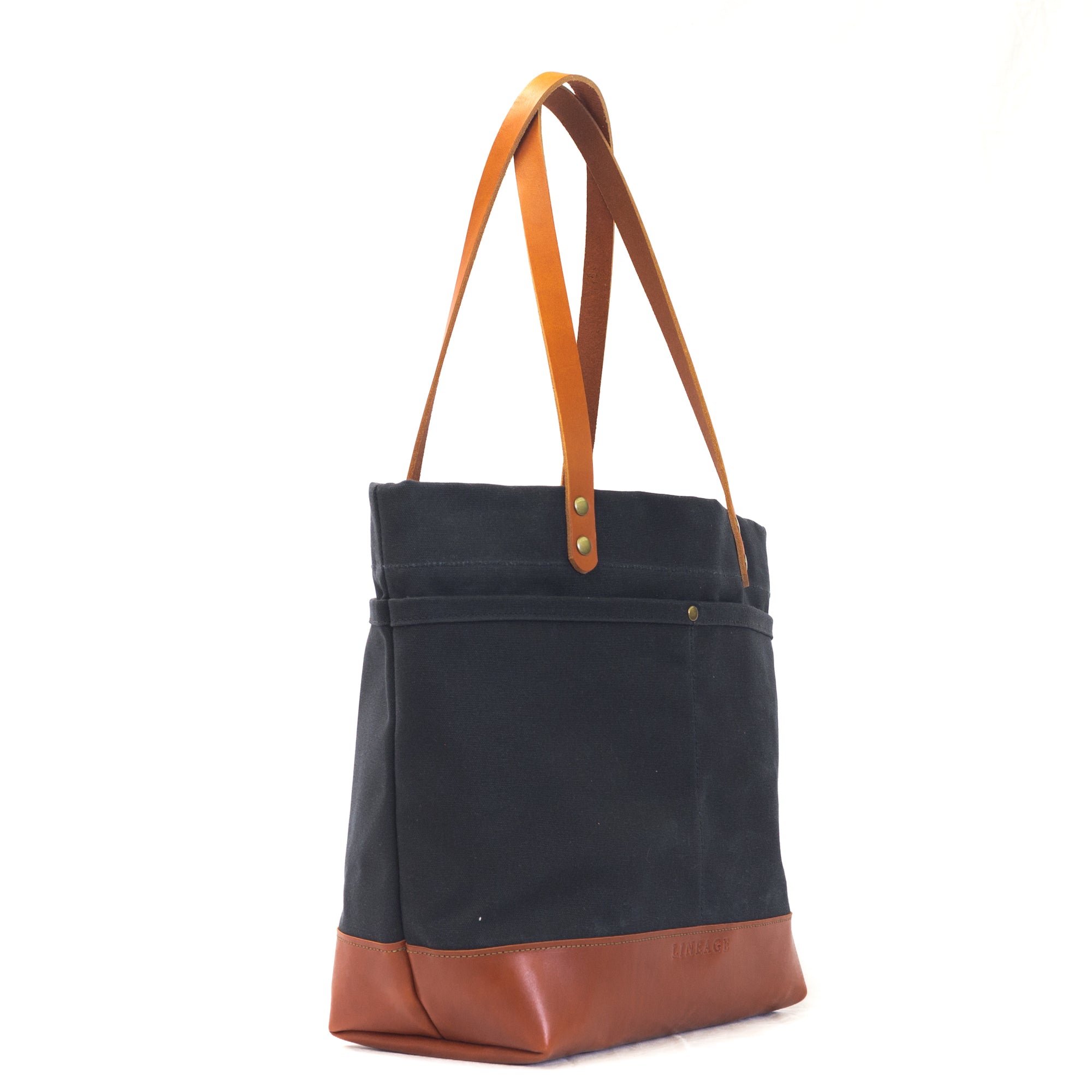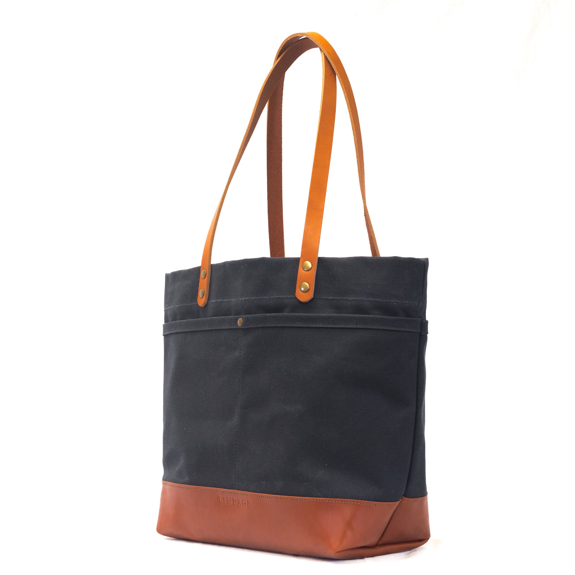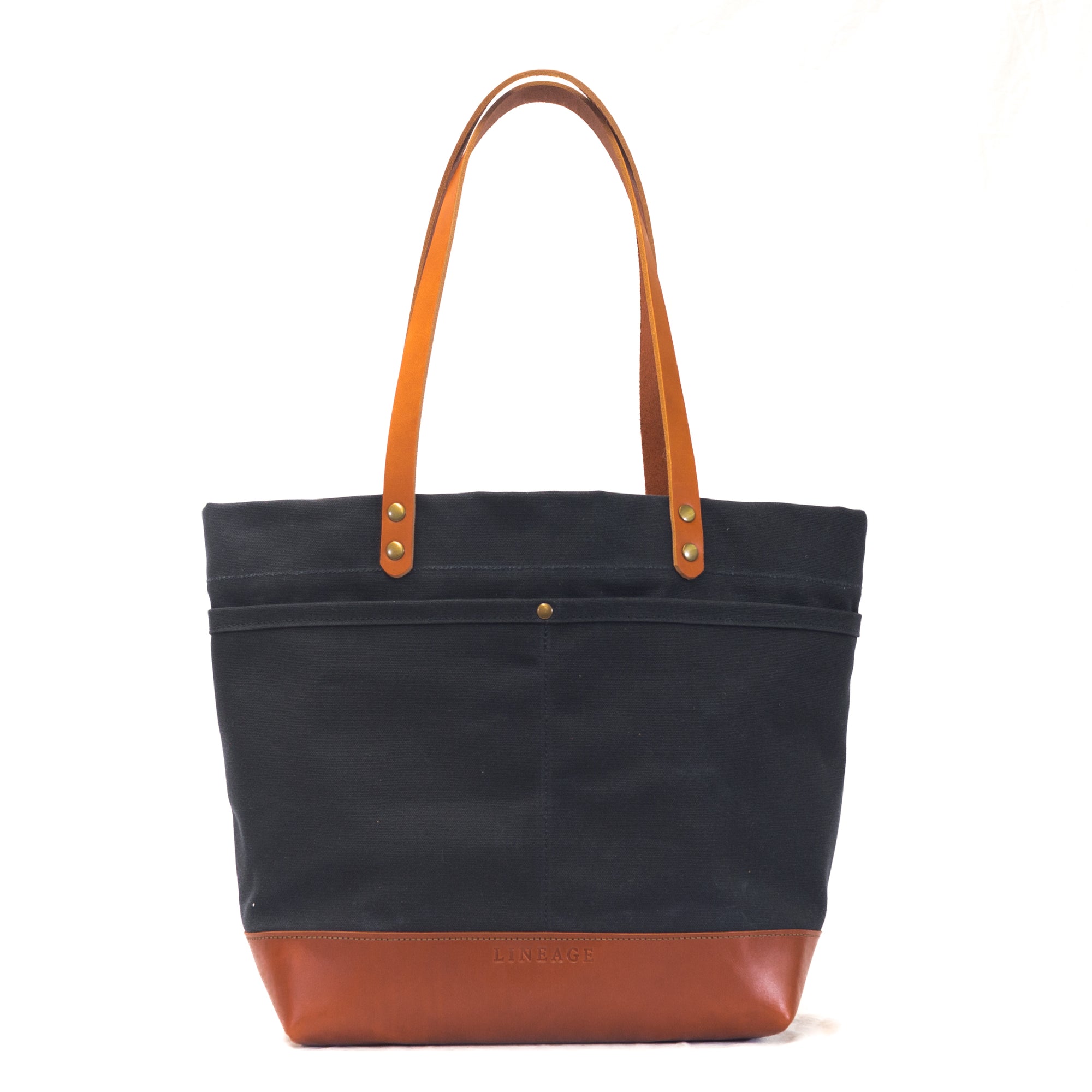 The deluxe version of our best-selling waxed canvas tote adds a bridle leather bottom panel for elegance and added durability. The bag features a large main compartment and six pockets for optimal organization. A perfect everyday bag for the office, farmers market, gym, beach, picnics, a night out on the town, or even as a very nice looking diaper bag.