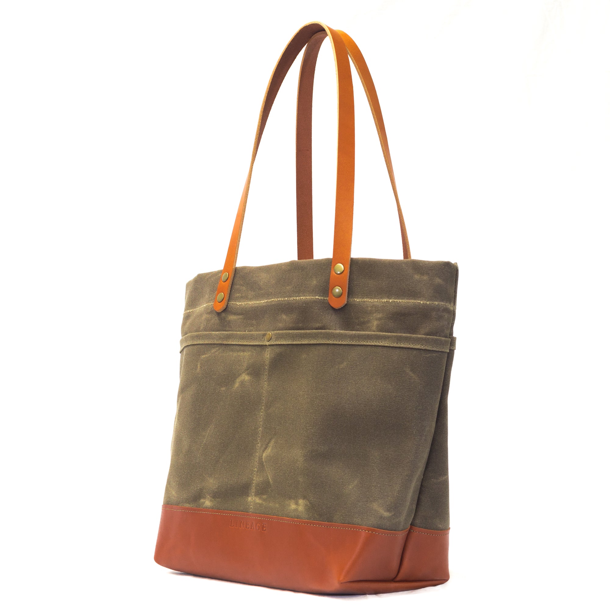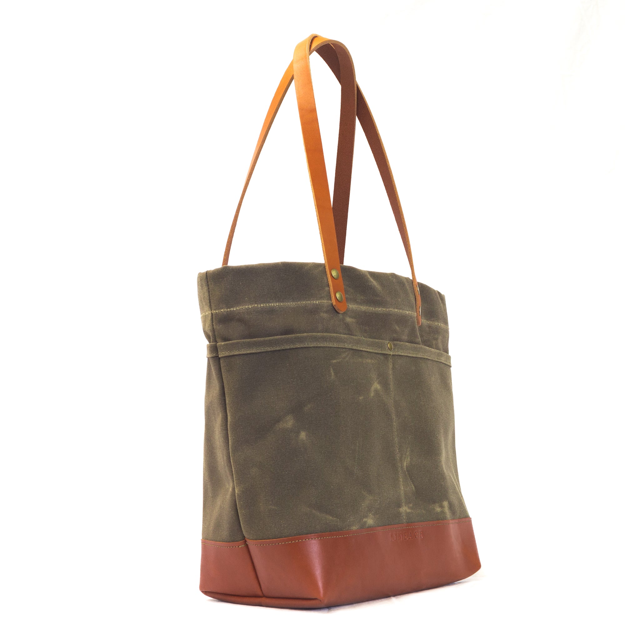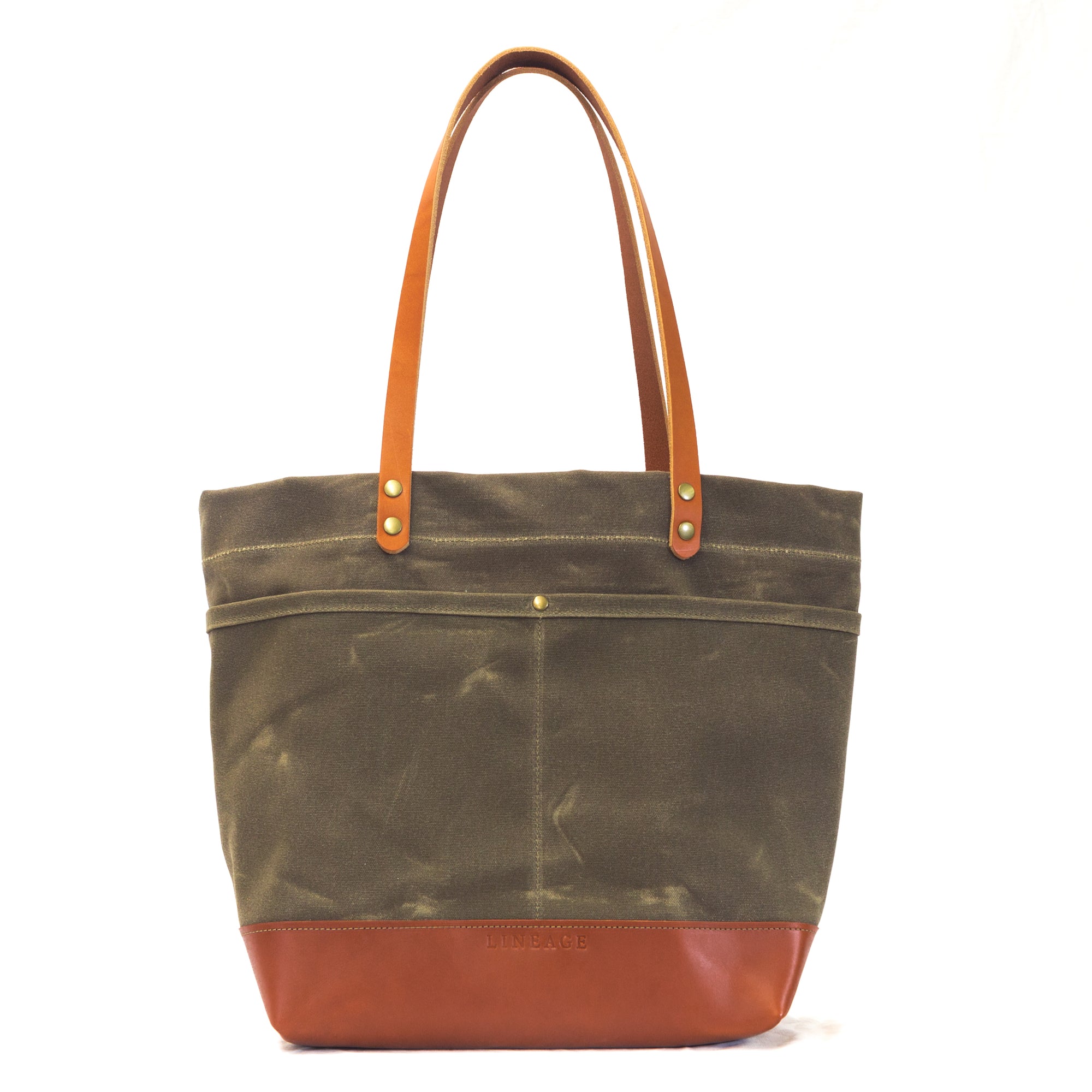 The deluxe version of our best-selling waxed canvas tote adds a bridle leather bottom panel for elegance and added durability. The bag features a large main compartment and six pockets for optimal organization. A perfect everyday bag for the office, farmers market, gym, beach, picnics, a night out on the town, or even as a very nice looking diaper bag.